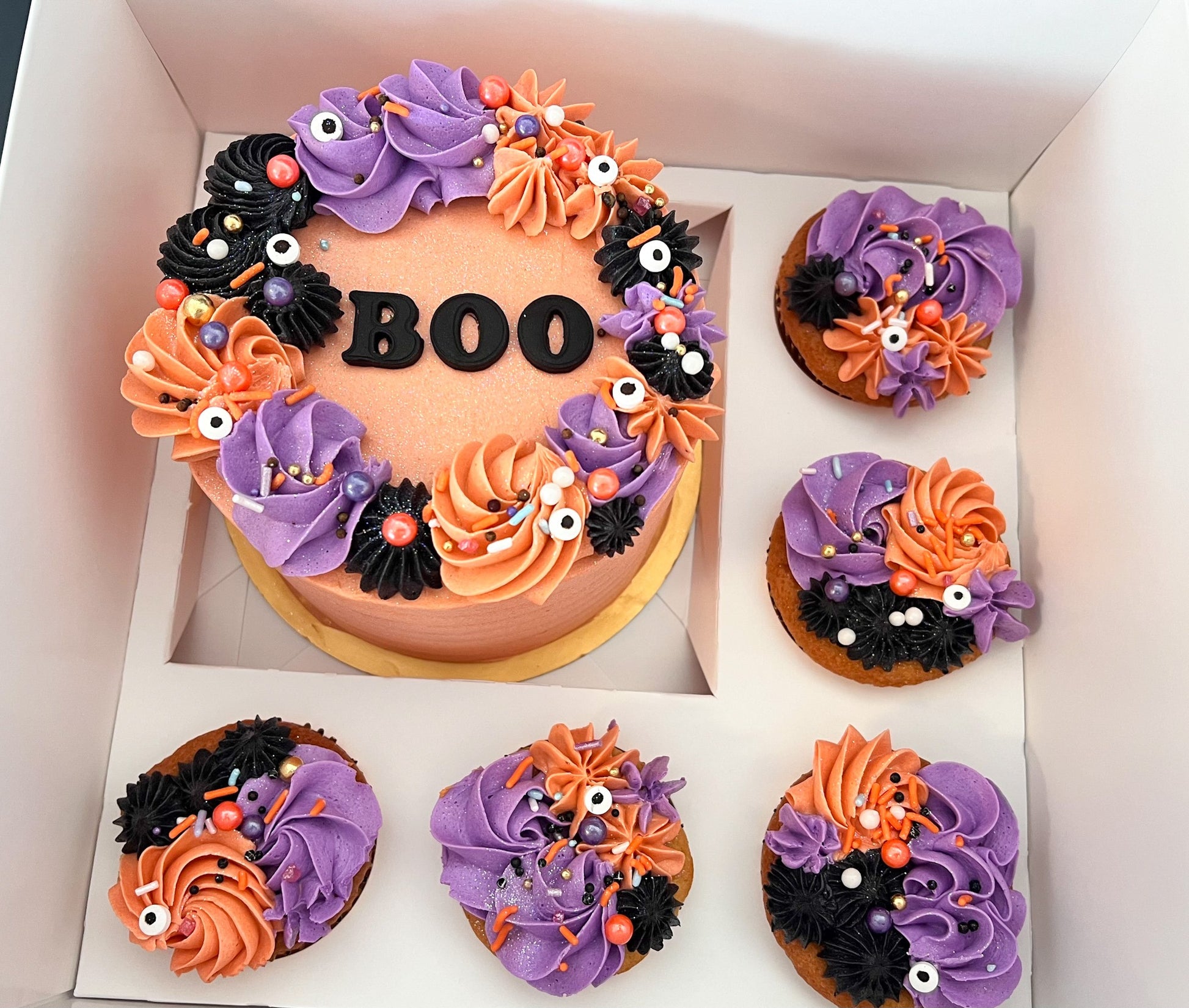 Each box contains a 5" cake (6 servings) and 5 cupcakes in the flavors of your choice.