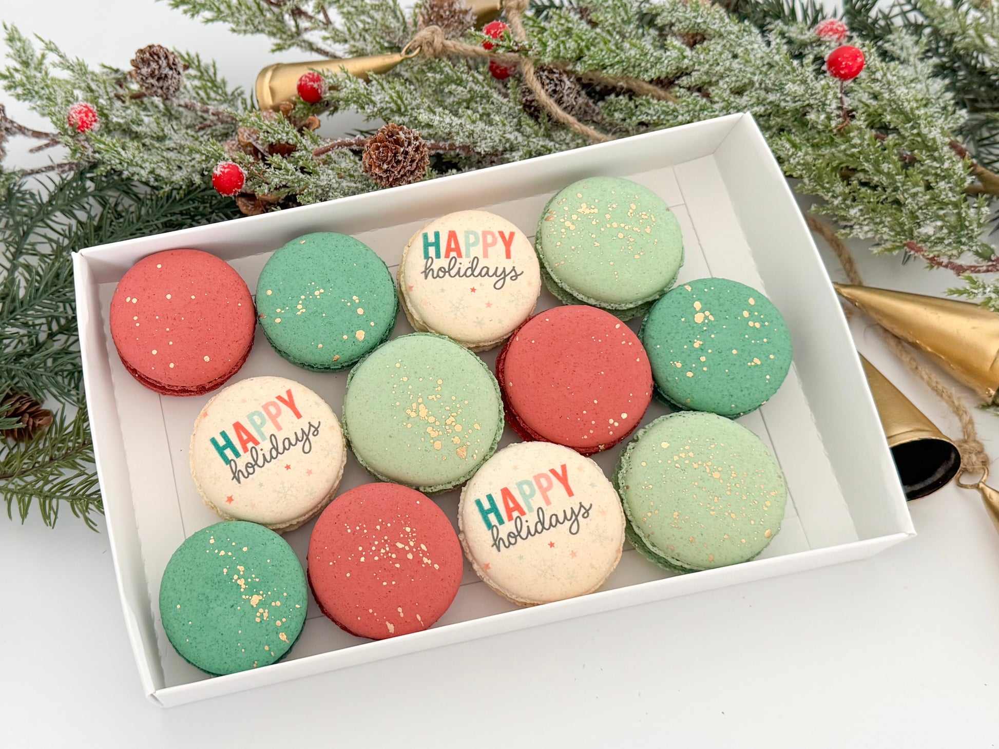 This festive box is perfect for stocking stuffers, teachers gifts, neighbors, co-workers or simply to enjoy at your Christmas table. The macaron flavors in this set are: Red velvet, Pistachio, Salted Caramel and Birthday Cake.
